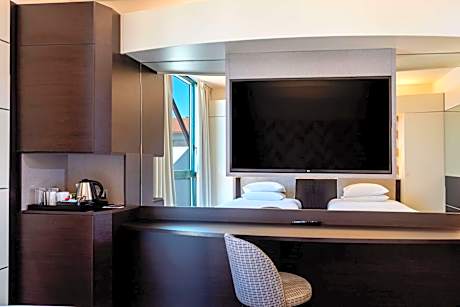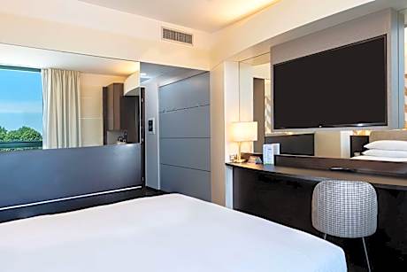 Overlooking the Le Robinie golf course, our hotel offers a prime location just 15 minutes away from Malpensa Airport. We offer a direct shuttle service to Busto Arsizio train station upon reservation. Our soundproof rooms are equipped with 55-inch LCD TVs, free WiFi and parking, mini-bars and air conditioning for all guests. At the hotel, you can relax in our lobby bar and enjoy delicacies at the Swing Restaurant. Our front desk is operational 24 hours a day. Located across the street from NATO Headquarters and only five minutes from the MalpensaFiere Exhibition Center, we are the ideal location for business travelers. In addition, the beauty of Lake Maggiore and Lake Como are at your fingertips, just 30 minutes away. Also take advantage of our modern fitness center and our 19,000 square feet of event space, which will make your stay unforgettable. Treat yourself to the comfort and convenience you deserve at our hotel.