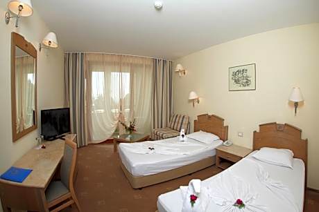 Boasting magnificent views over the bay of Sozopol, Duni Belleville - All Inclusive is part of the Duni Royal Resort and only 492 feet from the beach, featuring a spacious lobby with a bar, 4 outdoor swimming pools and a seasonal aqua park only for guests of the resort and free of charge. The town of Sozopol is a 10-minute drive away. A buffet breakfast, late breakfast, lunch, snacks, coffee and cake, sandwich corner, dinner and midnight snacks are included in the room rate. Unlimited domestic beverages are included as well. Additionally you can sample delicious Italian cuisine in the a-la-carte restaurant Milanese, or taste the unrivaled specialties of the Bulgarian cuisine at the traditional tavern on the premises. The resort features 10 tennis courts, tennis table, archery, darts, beach volleyball, aerobics and surfing. The beach of Belleville Hotel is guarded; it has a snack bar, medical station and provides parasols, sun beds and showers. There are diverse opportunities for entertainment at the Duni Royal Resort: visit the amphitheater in the Holiday Village area, have fun at the disco, the dance course or the pool games. Beach parties, live music and board games as well as bingo are organized.