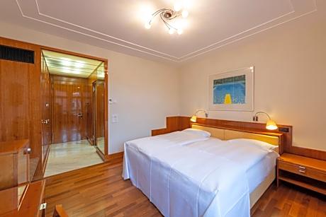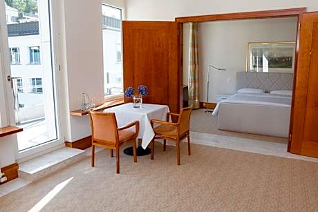 The Einstein Hotel enjoys a quiet location in the center of Sankt Gallen, at the edge of the pedestrian zone. It offers a fine dining restaurant and a bar, as well as free WiFi access in the entire building. The rooms feature luxurious materials such as marble, cherry wood, high-quality fabrics and natural wool carpets. A work desk is available in every room. Wired internet access is available in the rooms free of charge. The Einstein Gourmet restaurant overlooks the Old Town of St. Gallen and offers creative haute cuisine. The more casual Bistro St. Gallen is available for all-day dining. The Einstein Bar serves a variety of cocktails in classy surroundings. The year-round fitness center with a spa section is directly connected to the Einstein Hotel and can be used free of charge (minimum age 14 years accompanied by parents or legal guardians.). It includes an extensive gym, indoor pool, steam and soft steam bath, sun beds, and a variety of massages and body treatments. The St. Gallen-Altenrhein Airport is 12 mi away, and Zurich-Kloten Airport is 50 mi away. Private garage parking is available. Guests receive the Mobility Ticket which includes free use of the public transport in and around St. Gallen and to Lake Constance. Minimum age for spa is new 12 years accompanied by parents or legal guardians.