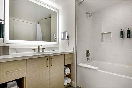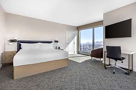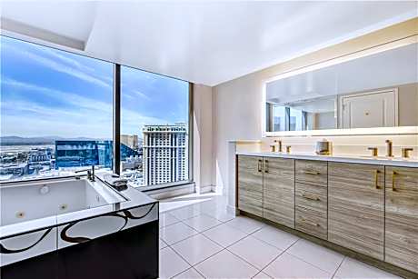 Guest rooms are designed to offer a tranquil oasis amid the city's buzz, featuring floor-to-ceiling windows that provide panoramic views of the Las Vegas skyline, coupled with sleek marble bathrooms for a touch of sophistication. Every room is equipped with modern kitchen amenities, including a microwave and mini-fridge, alongside a 50-inch flat-screen TV with an array of cable channels.