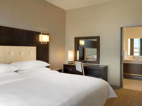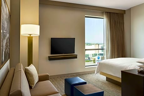 Each suite features a separate seating area with a sofa bed and flat-screen TV, providing ample space for relaxation. Additional in-room amenities include a wet bar, refrigerator, and microwave, ensuring a comfortable and convenient stay.