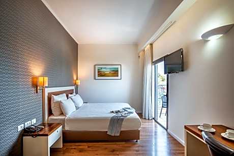 Room with attached bathroom with parquet floors. Offers free Wi-Fi, air conditioning, and a flat-screen TV. The balcony offers views of the pool or the lake.