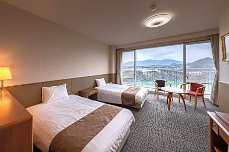 The spacious quadruple room offers air conditioning, tatami, a balcony with lake views as well as a shared bathroom boasting a bidet. The unit has 4futons.