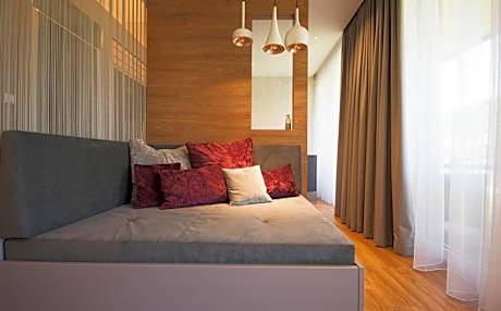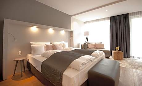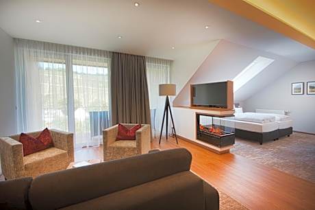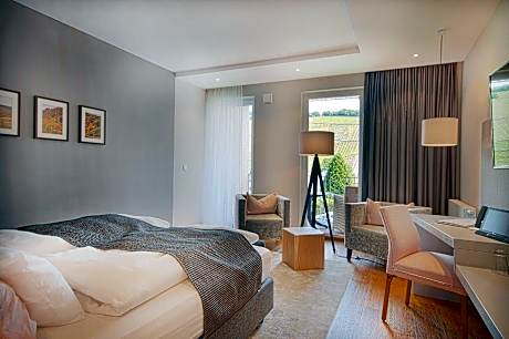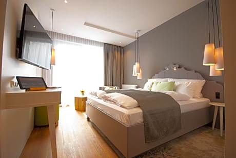 This room comes with an armchair, stool, a king-size bed, a flat-screen TV, a tablet and a radio.