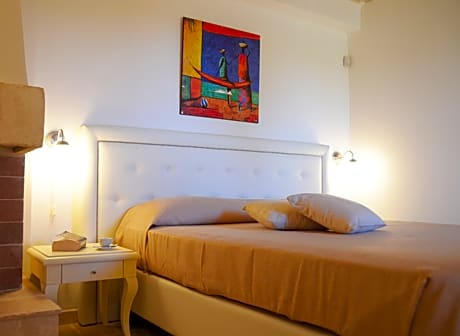 Spacious, stone-walled room with white classic furniture, a patio and fireplace. Includes a mini-bar, air-conditioning and flat-screen satellite TV. The bathroom is complete with a hairdryer.