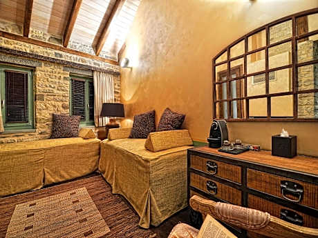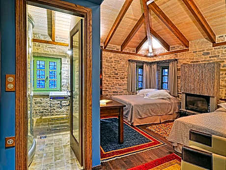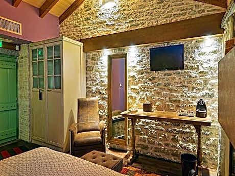 Stone-built room with wooden-beamed ceilings and fireplace. It is equipped with a Nespresso coffee maker and a spacious bathroom with hydromassage shower cabin.