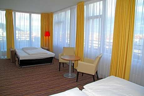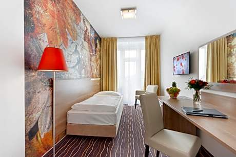 The Akcent hotel is located on the 7th floor of a 1930s' office building in Functionalist style right at the Anděl metro station and features splendid views over Prague from all of the rooms. Guest can benefit from the near entrance to the metro, it is just 66 feet from the property. A supervised outdoor car park is available at an additional cost for guests' convenience. The spacious and nicely furnished rooms feature a balcony, air-conditioning, hairdryer, safe, a satellite TV, tea and coffee making facilities, a fully stocked mini-bar and free Wi-Fi access. Daily lunch menus and an à la carte menu are served at the restaurant. Friendly and English speaking staff are at guests' disposal 24 hours a day. The hotel is located in a quiet part of the Smichov district, from where several tram lines connect to the center of the city. The picturesque Lesser Town is just a 10-minute ride by the underground or 30-minute walk away. The Anděl City and Zlatý Anděl shopping centers are very close by. Moreover, the Nový Smíchov shopping, business and entertainment center with its 2 multiplex cinemas and several restaurants is just a 3-minute walk from the hotel.