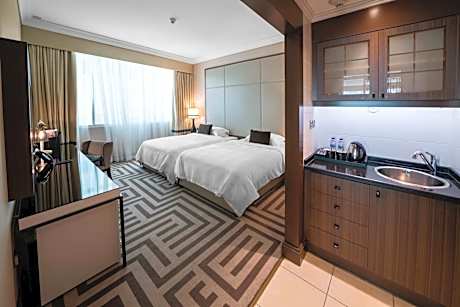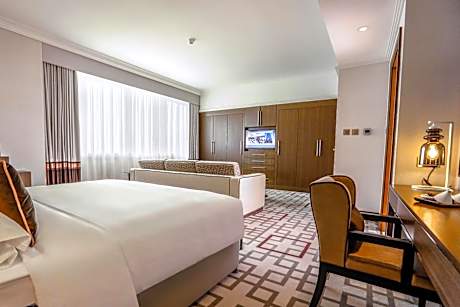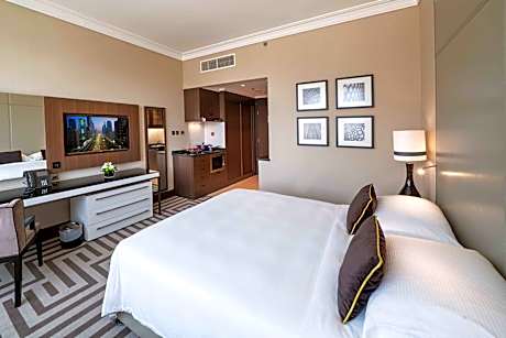 Relax, dine or work in comfort in our 36 sqm Studio with king bed, a spacious sitting area with a coffee table, writing desk and a well-equipped kitchenette. The luxury marble bathroom includes a walk-in shower.