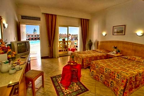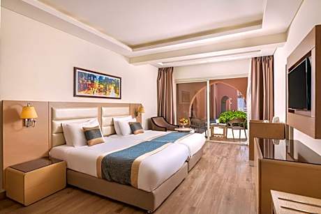 This 4-star Alf Leila Wa Leila meaning thousand and a night is located in Hurghada is just over a quarter mile from the beach. It features 6 swimming pools, a free shuttle to and from the beach, 5 dining outlets, and a tennis court. Hotel offers WIFI in the entire property. Hotel base on all-inclusive concept. Rooms at the Alf Leila Wa Leila are bright and airy. They include a spacious balcony, a sitting area with a work desk and satellite TV. The bathrooms include a luxury toiletries. All-inclusive hotel has has an elegant restaurant that serves regional and international cuisine at the Le Marche Restaurant, Asian restaurant, L`Asiatique, Italian Restaurant, La Casa & Oriental Restaurant; Tagine. In addition to the food court "Club Mac " and "Beach Bar " for Snacks. Guests can relax with a massage, or work out at the gym. Children can have fun at the kids’ club and playground. The entertainment staff organizes spectacular sound- and light shows about Egypt's history. Free private parking is available on site. The Leila Wa is 20 minutes from Hurghada International Airport and 25 minutes from the center of the city by car. Property offers free access to the beach of Dana Beach Resort.