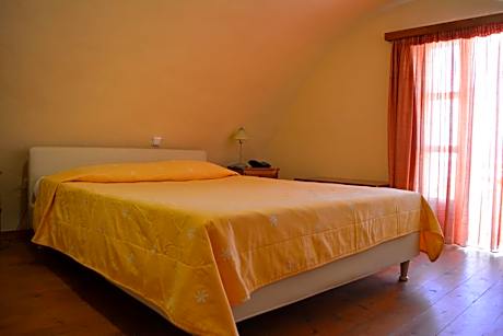 This split-level maisonette is equipped with wood furnishings and wood beam ceilings. It has a private bathroom with shower and opens out to a balcony with views over the Aegean Sea.