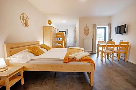 Apartmány NONE in Branná provides accommodations with a garden and a shared lounge. This condo hotel offers free private parking and a shared kitchen. The rooms include a flat-screen TV with streaming services. At the condo hotel, the units include a wardrobe. Rooms are equipped with a kettle, a private bathroom, and free Wifi, while certain rooms also offer a terrace and some have mountain views. At the condo hotel, units are equipped with bed linen and towels. The condo hotel also features an outdoor swimming pool and a spa facilities for guests to relax in. For guests with children, Apartmány NONE provides an indoor play area and a kids' club. Skiing, cycling, and hiking are possible within the area, and the accommodation offers ski storage space. Museum of Paper Velké Losiny is 12 miles from Apartmány NONE. Pardubice Airport is 73 miles from the property.