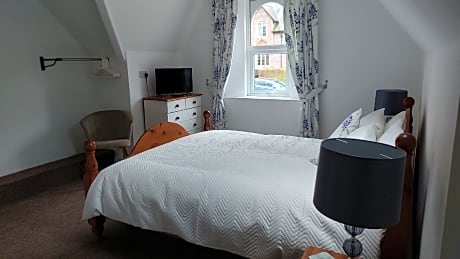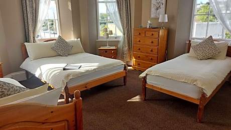 This family room with a double bed, single bed and bunk beds has two separate but private bathrooms not shared with other quests. The room also has it's own basin. Guests enjoy a view across Torquay from the North and West facing windows. The newly decorated room has bedside tables, chest of drawers and hanging space and a sofa. There is a central and bedside lamps.. There is a flat screen TV with DVD player. Extras include a beverage tray with a selection of biscuits and water. A hairdryer is available and there is plenty of storage under the beds for suitcases and bags.