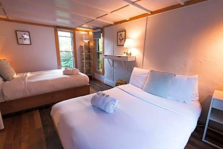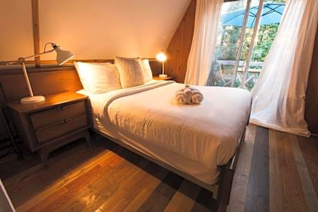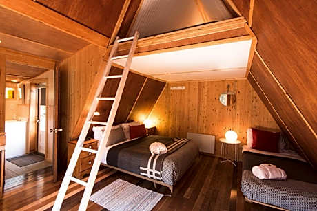 This room for 4 people, located on the ground floor of the main chalet, offers access to a shared bathroom and kitchen. A glass door provides easy access to the hot tub and barbecue.