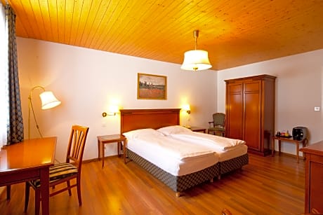 The hotel is centrally located and surrounded by a large park. You will find a cheerful and familiar atmosphere combined with the best Swiss hotel tradition. Our guests enjoy a spacious hotel lobby, a cozy library for quiet moments, and a children’s playroom. The indoor swimming pool invites you to relax after an active day, while the sauna, infrared cabin, and cold-dip pool provide additional wellness experiences. In the morning, you can enjoy your breakfast in our beautiful nostalgic Art Nouveau dining room, with a generous buffet offering a wide selection of fresh products. In the evening, we serve a 4-course dinner menu on request, or you may choose our rustic à-la-carte restaurant with seasonal regional specialties (closed on Mondays and Tuesdays). Biking and skiing are available in the surrounding area, and for younger guests there is also a children’s playground in our park.