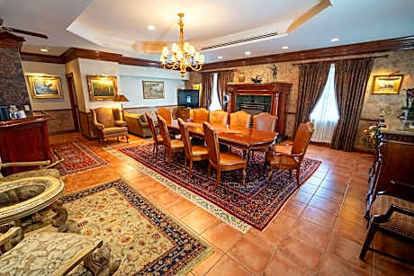 This room features a fireplace, a refrigerator and a wall safe.