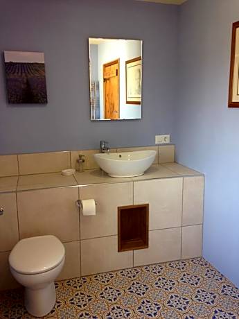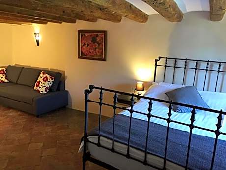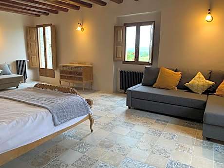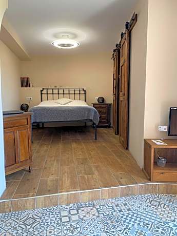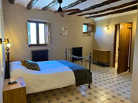 This double room with private bathroom overlooks the terrace with views of both the church of Santa Barbara and the countryside. The room retains the original wooden beams and has traditional floor tiles.