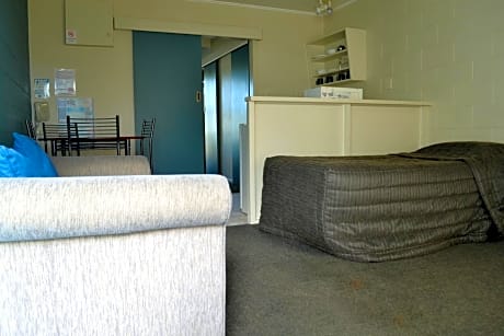 Apartment has a kitchenette with a stove top, a fridge and a microwave. The seating area comes with a sofa and a dining table.
