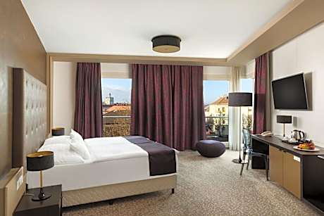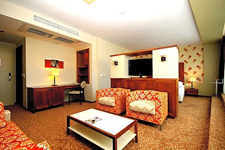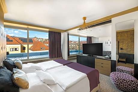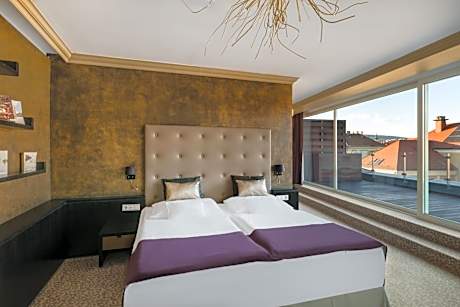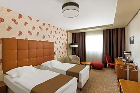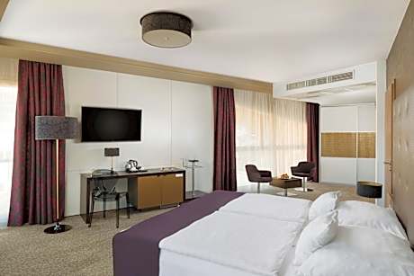 Featuring a furnished 13-square-yard terrace, this air-conditioned unit has views of the Mecsek mountains. There is a desk, mini-bar, coffee and tea bar, laptop-size safe and telephone. The bathroom is fitted with a bath.