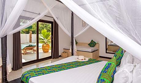 Located in Jambiani, a few steps from Paje Beach, Daima Villas provides accommodations with an outdoor swimming pool, free private parking, a garden and a shared lounge. With a terrace, the 2-star hotel has air-conditioned rooms with free WiFi, each with a private bathroom. The property has room service, a concierge service and organizing tours for guests. At the hotel, rooms come with a desk. Each room comes with an electric tea pot, while selected rooms are equipped with a kitchen with a fridge, a minibar and a stovetop. Guest rooms include a safety deposit box. Breakfast is available, and includes à la carte, continental and vegetarian options. At Daima Villas you'll find a restaurant serving African, Italian and Mediterranean cuisine. A vegetarian option can also be requested. The area is popular for cycling, and car rental is available at the accommodation. Jozani Chwaka Bay National Park is 24 miles from Daima Villas.