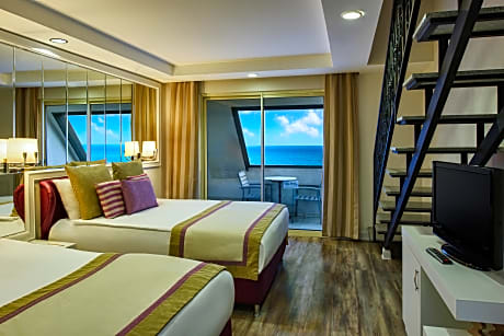 Delphin Diva is a luxury all-inclusive resort in Antalya, featuring 252 yards of private beach and an outdoor pool with water slides. It is 7 miles from Antalya International Airport. The spacious rooms Delphin Diva Premiere all feature private balconies, and every room has a sitting area with satellite TV. All rooms have a private bathroom and a hairdryer. The Delphin Diva Resort has several restaurants, including Italian, Japanese, Turkish and Mexican specialties. There are several bars, including a pool-side bar and a beach bar. The hotel has tennis courts and basketball courts, a bowling alley and a high-tech game room. The Diva Premiere has a health and beauty salon, and an entertainment club for children. The hotel is steps from Lara Beach and 9 miles from downtown Antalya. Private on-site parking is free of charge.