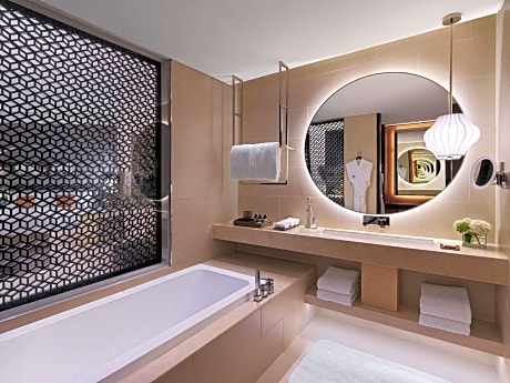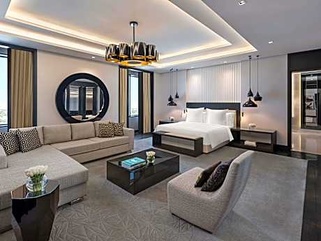 The Fairmont Riyadh, a luxury hotel and convention center, offers opulent accommodations in the Business Gate. Ideal for both business and leisure travelers, it's a mere 15-minute drive from the airport and 20 minutes from Riyadh City Center. The hotel boasts 298 rooms and suites, five distinct dining options, 4, 300 m² of meeting space, sophisticated event and wedding venues, an exclusive ladies' lounge, and Fairmont's signature spa and gym with an indoor swimming pool.