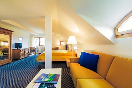 This spacious room comes with a balcony, a seating area with a sofa and a TV. The private bathroom is fitted with a shower and a hairdryer.
