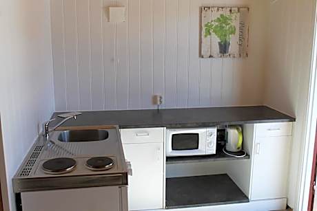 Basic cottage with a fridge, patio and access to shared bathroom and kitchen facilities in the service building. The shower comes at a surcharge.