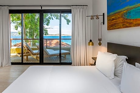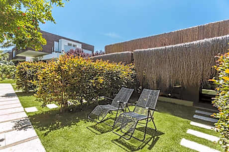 Tastefully decorated, this bright room features all-white walls and parquet floors. It includes a marble bathroom. It also offers garden views.