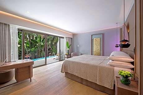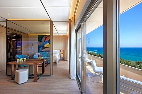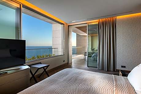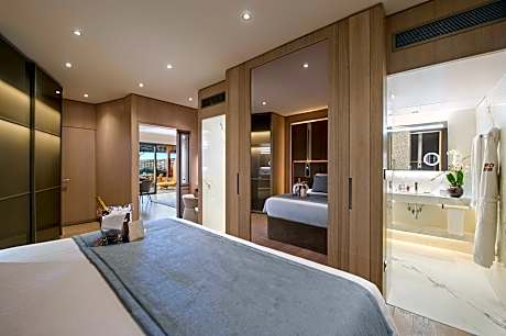 The Two Bedroom Four Seasons Residence represents the ultimate in luxury living. Located on various floors of the residence building on the west side of the Hotel, they consist of a living, dining area with an open plan fully equipped kitchen. The spacious bedrooms both with ensuite luxury bathrooms offering bath & separate shower, have ample wardrobes and storage space and there is an additional guest WC off the living room. The kitchen is fully equipped with state of the art Miele equipment including Fridge/Freezer, microwave, large oven, Dishwasher and wine fridge. The luxurious living room with light summer cool finishes and marble floors is furnished with Flexform furniture and a 65” Samsung curved UHD TV. The spacious patio offers outdoor dining and relaxing lounge space with amazing sea and city views. These Residences can accommodate up to five people.