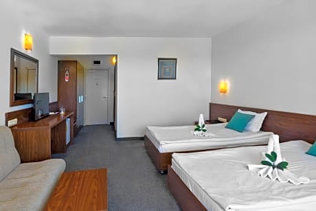 This hotel, which was lastly renovated in 2009, is ideally located in the centre of Sunny Beach. The sprawling beach and the sea are only a few metres away, and a wide range of shops and entertainment venues, restaurants, bars, and nightclubs are situated in the near vicinity. The hotel is easily accessible, as it lies on one of the main streets of the resort and also on the promenade. The nearest bus stop can be found approximately 1 km away. This hotel comprises a main building with six floors and a neighbouring building with four floors. Guests are welcomed in the foyer with a reception desk which is manned around the clock. Further facilities include a cafe bar and a restaurant where guests can enjoy a meal or drinks. Laundry and room services as well as medical assistance may also be taken advantage of, and those arriving by car may make use of the car park.