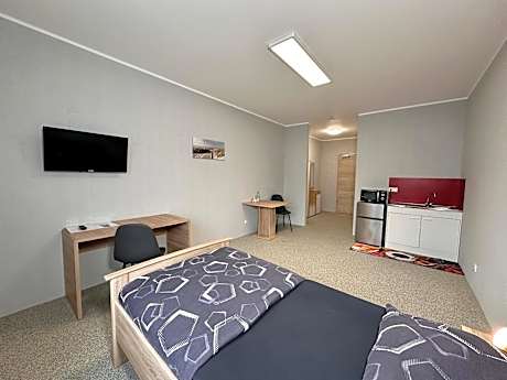 The double room offers a wardrobe, heating, as well as a private bathroom featuring a shower. The well-equipped kitchenette features a refrigerator, kitchenware and a microwave. The spacious double room provides soundproof walls, a tea and coffee maker, a seating area, a dining area, as well as a flat-screen TV with satellite channels. The unit offers 2 beds.
