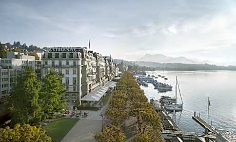 The luxurious Grand Hotel National is situated right on the shore of Lake Lucerne, only a 5 minute walk from the train station and the historic quarter. Lucerne's legendary luxury hotel was built in the 1870s by César Ritz and Auguste Escoffier. Today it still provides highest-quality accommodations, culinary perfection and great musical entertainment in the National Bar. The rooms and suites offer views of the city or the lake. Some include Italian marble floors, walls covered with luxurious silk wallpaper, hand-woven carpets and comfortable sofas and chairs upholstered with the finest materials. From the Grand Hotel National Luzern you can see the famous Rigi, Stanserhorn and Pilatus mountains as well as the highest peaks of central Switzerland.