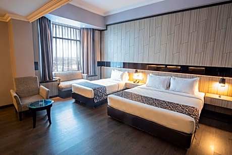 Located in central Pekanbaru, Grand Jatra Hotel is directly connected to Mall Pekanbaru and less than a minute’s drive from Senapelan Plaza. It offers a business center and meeting rooms. Free parking is provided. Grand Jatra Hotel Pekanbaru is a 5-minute drive from Pasar Bawah Souvenir Center. Sultan Syarif Kasim II Airport is a 20-minute drive away. Rooms each have a flat-screen cable TV, tea/coffee-making facilities and a safety deposit box. Bathroom toiletries and slippers are provided. Guests can enjoy use of the spa, fitness center and outdoor pool. In-room massage services are offered upon request. Car rental and laundry services are also available. A selection of Asian and international cuisine is served in Bellagio Restaurant. Lively night entertainment can also be enjoyed on-site at the Embassy Pekanbaru Club.
