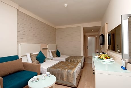 Enjoying fantastic panoramic views over the beautiful Mediterranean Sea, this popular hotel is situated just 50m from the renowned, sandy Kleopatra Beach and 1km from the centre of Alanya. A large outdoor pool, a separate children's pool and a sauna are available for guests. The famous attractions of Alanya such as Damlatas Caves or the Red Tower are just a short stroll away, while Alanya's Castle which overlooks the beach from its clifftop position, is easily reached by public transport. Exuding a chic, understated style, all luxury hotel rooms including 2 rooms especially equipped for the disabled have views of the sparkling Mediterranean or the intriguing Toros mountains. All rooms are equipped with high-quality amenities.