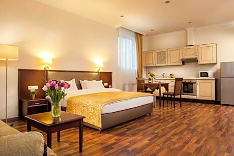 Located in central Kiev, a 5-minute walk to the Olimpiysky Stadium and Operetta Theater and a 15-minute walk to Khreschatyk Street, this modern hotel offers elegant rooms with a flat-screen TV and free Wi-Fi. All air-conditioned rooms at the Greguar Aparthotel offer satellite TV, wooden flooring and a washing machine. Kitchens come complete with a refrigerator, microwave and stove. Meals can be enjoyed in the spacious dining area. A variety of bars and restaurants are within walking distance. Aparthotel offers a concierge service, car rental and 24-hour front desk. Shuttle services can also be organized. Olympiyskaya Underground Station is a 2-minute walk from Greguar, offering connections to Kiev International Airport in 60 minutes.