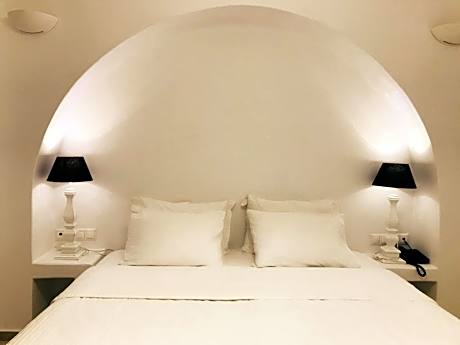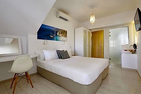 These double rooms with no view or window, are located on the lower levels of the property, some with direct access to the pool area. The units offer 1 Coco-Mat bed, private bathroom with shower and Apivita toiletries, LCD TV, a mini bar, desk surface, autonomous air conditioning unit and modern lighting fixtures. The double rooms can accomodate up to 2 guests. Room size 20m2