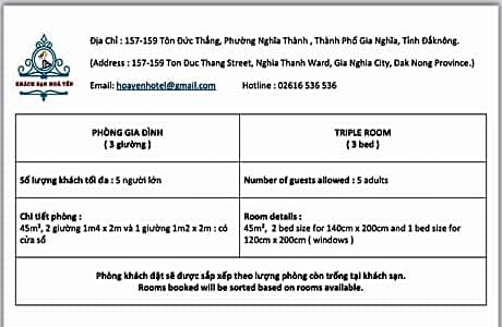 Experience an abundance of unparalleled facilities and features at Hoa Yen Hotel. Maintain seamless communication using the complimentary Wi-Fi at hotel.For visitors traveling by automobile, complimentary parking is available. For extended visits or whenever required, the laundry service ensures your preferred travel garments remain fresh and accessible. Kindly note that smoking is prohibited in the hotel to ensure fresher air for all visitors. At Hoa Yen Hotel, every guestroom is provided with convenient amenities and fittings to ensure a comfortable stay.Elevate your experience at hotel with the knowledge that certain rooms are equipped with air conditioning, ensuring a more pleasant stay for you. Certain rooms offer in-room amusement features such as the television for your enjoyment.In select rooms at the hotel, mini bar is available for those moments when it seems necessary.In the hotel, certain guest bathrooms come equipped with essential bathroom amenities, such as a hair dryer and towels, ensuring a comfortable stay for guests.