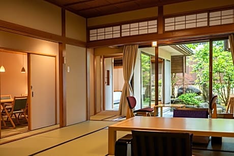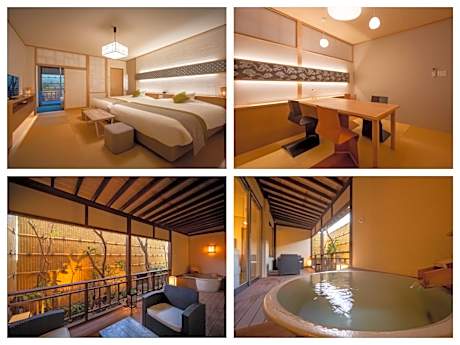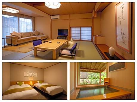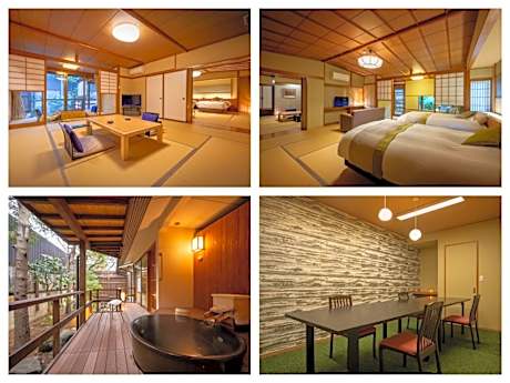 The private open-air bath is the standout feature of this family room. The spacious family room features air conditioning, tatami, as well as a private bathroom boasting a bath and a shower. The unit has 2 beds and 4 futons.