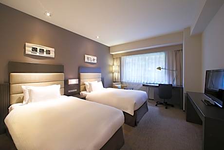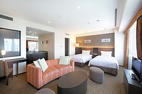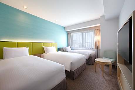 This rooms comes with 2 single beds (width 43 in) + 2 extra beds (width 31 in) This room is equipped with a flat-screen TV with satellite channels, a refrigerator and an air humidifier. A window to the private bathroom makes this modern room feel more spacious. Free wired internet access is available.