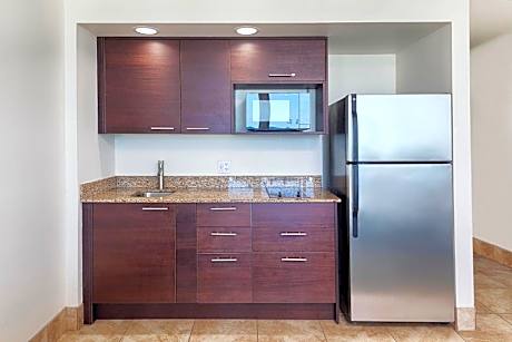 This oceanfront suite features a separate living area with a sofa and a kitchenette with a 2-burner stove top, microwave, and refrigerator.