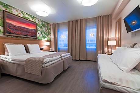 Located only 1476 feet from central Rovaniemi and 164 feet from Bath House Vesihiisi, is Hotel Aakenus. It offers free parking and freshly decorated rooms and apartments with a TV and free Wi-Fi. All rooms at Aakenus Hotel have a work desk, a small fridge, a kettle and hairdryer. Ironing facilities can be borrowed at the reception. The spacious units have a private kitchen with a microwave, fridge and a coffee maker. The on-site restaurant offers home-cooked meals. A dinner buffet is served from Monday to Saturday between 18.00-21.00. Breakfast is served daily. Drinks are available in the Lobby Bar. Relaxation options include a sauna and a terrace. Santa Claus Village Amusement Park is a 5-minute drive from the hotel. Rovaniemi Central Station is 0.9 mi away.