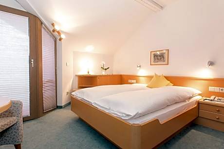 With natural wood furniture and carpeted floors, this room includes a satellite TV and a private bathroom. The room is located on the back of the property.