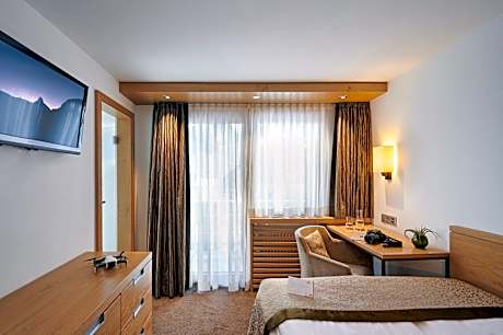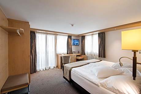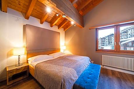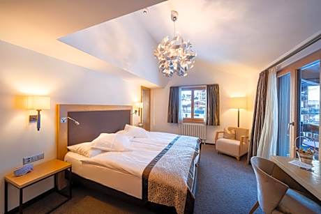 The room features a large HD flat-screen TV, a walk-in shower and high-quality bed linen with Matterhorn design. The bed is only 4.6 feet wide.