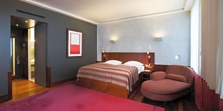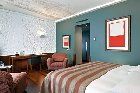 This suite provides a king size bed and is elegantly decorated with a seating area. There is also a flat-screen TV and fully soundproofed windows.