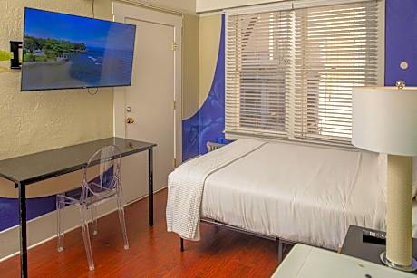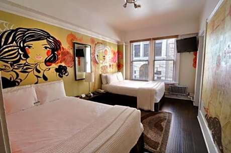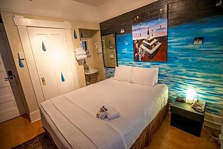 These Residential Standard Queen with Shared Bathroom rooms feature a queen-sized bed. Each room contains a washbasin. Shower and toilet are down the hall and are shared among a couple of rooms. All rooms have art displayed on the walls.