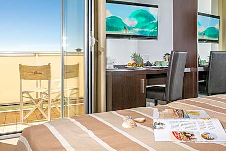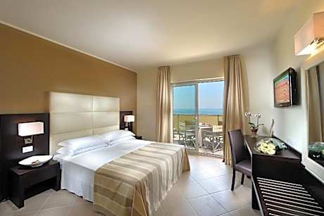 Hotel Excelsior is set directly on the beach in Bibione, and offers a large swimming pool with shallow end and a a sea-view terrace with hot tub, shared with the partner hotel next door. All rooms come with balconies overlooking the Adriatic Sea. Guest rooms features satellite TVs and air conditioning. The rate includes sunshades with safe and 2 sun beds to use on the fully equipped private beach. The hotel restaurant provides a large choice of menus including vegetarian meals and a children’s menu. A generous buffet breakfast is included and is served in a bright dining area. You will find table tennis, free bicycles, comfortable lounges, a bar, and a TV room at Hotel Excelsior. Children can play in the indoor play room or outdoors in the playground. You can also book 2 tennis courts and a small football pitch.