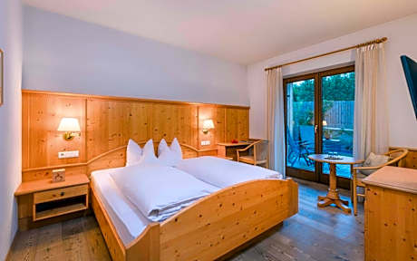 This double room with wooden floors and furnishings comes with an LCD TV with satellite channels and free toiletries. It features a bathroom, seating area and view of the mountains.