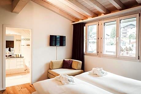 Room with stylish Alpine-style furnishings and wooden floors. Some rooms have a French balcony offering mountain views.