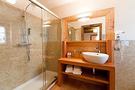 Room with attached bathroom with Alpine-style décor, wood floors, a mini-bar and a safe. The private bathroom is complete with a hairdryer. WiFi is free.