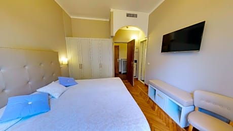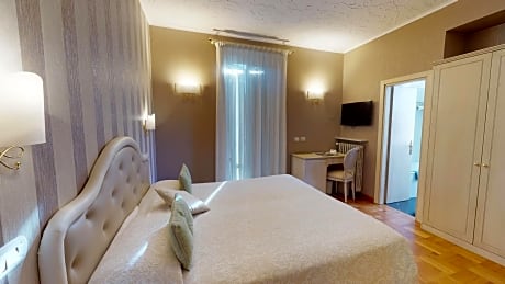 junior suite is 205 square feet and includes a double bed 131-150 width plus extra beds on demand, desk, satellite tv , hairdryer, safe, bathrobes, and slippers.